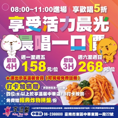 【台南中華店】晨唱優惠享好康