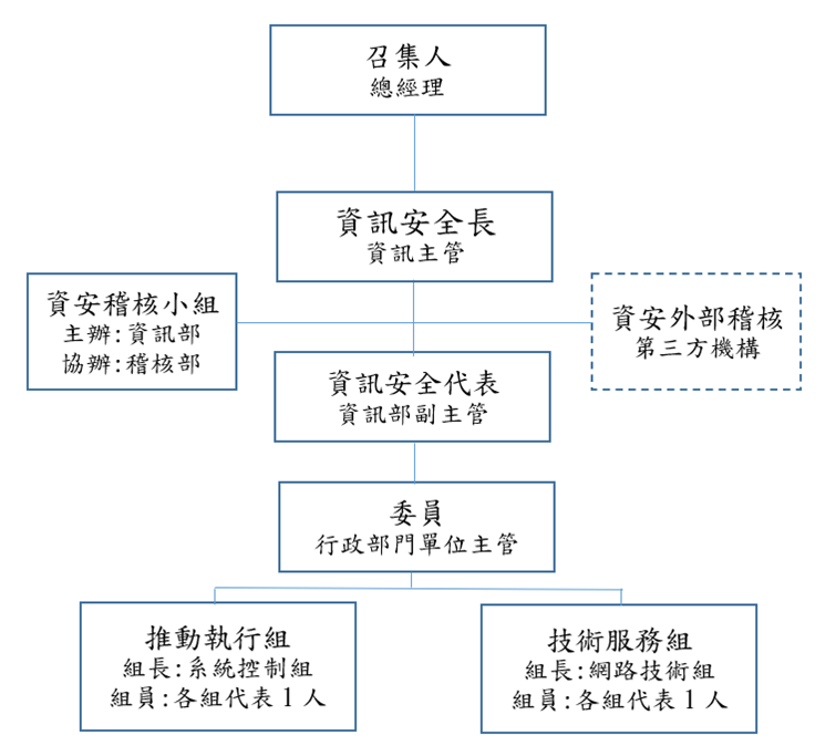 本公司設立「資訊安全委員會」,明確規範資訊安全管理作業之人員權限與責任,協調事務及推動資訊安全管理事宜,確保資訊安全各項管理規範能有效持續地執行,並達成資訊安全之政策與目標。