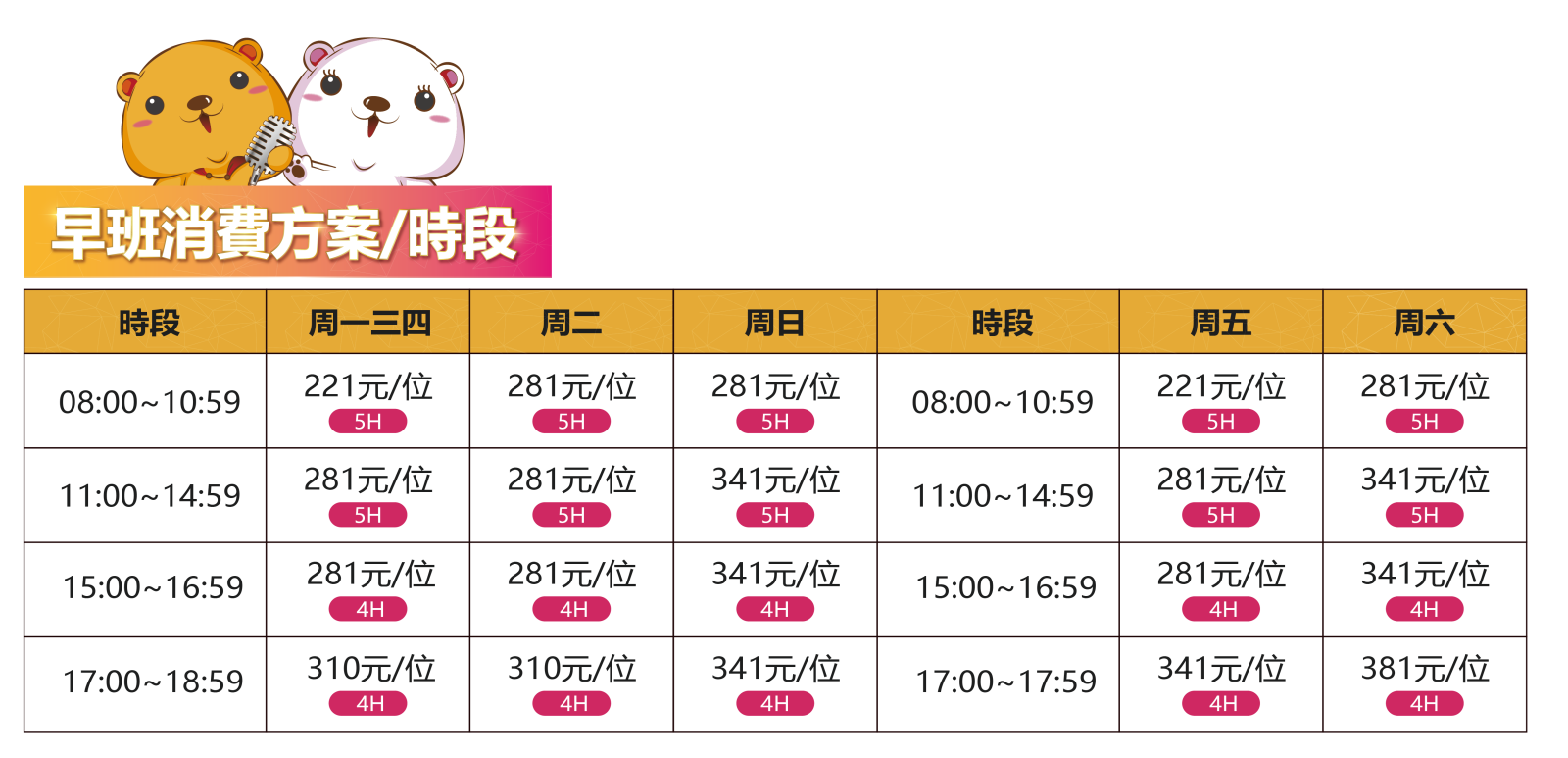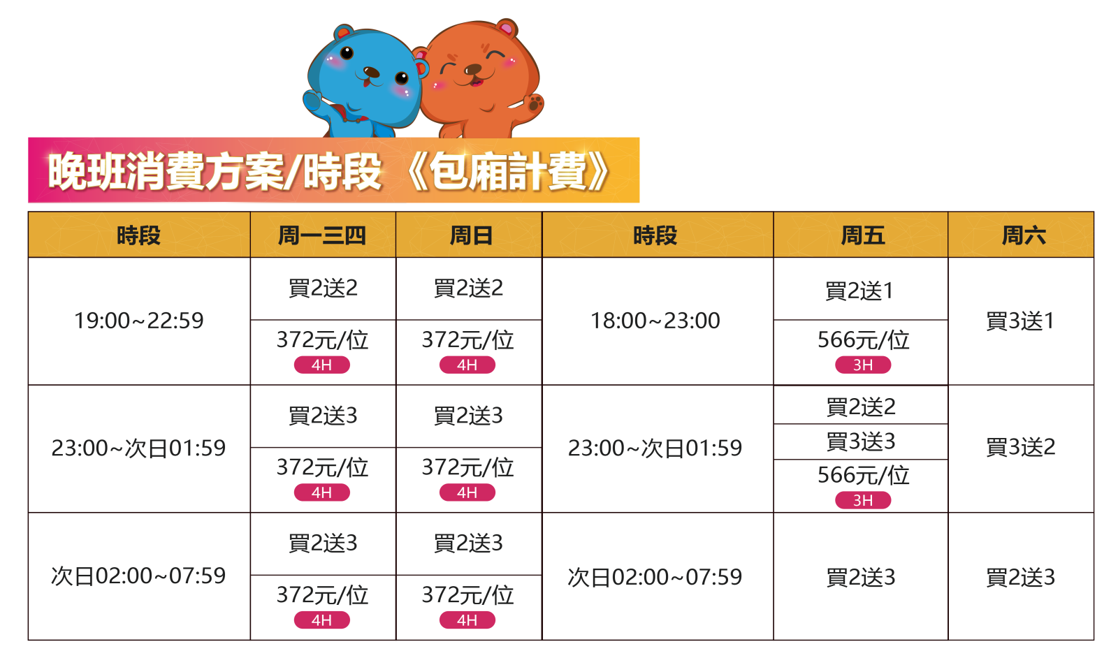 ★ 晚班包廂消費需加收最低消費$59(人) 及總金額10%服務費;人頭計費方案已包含低消$59(人)